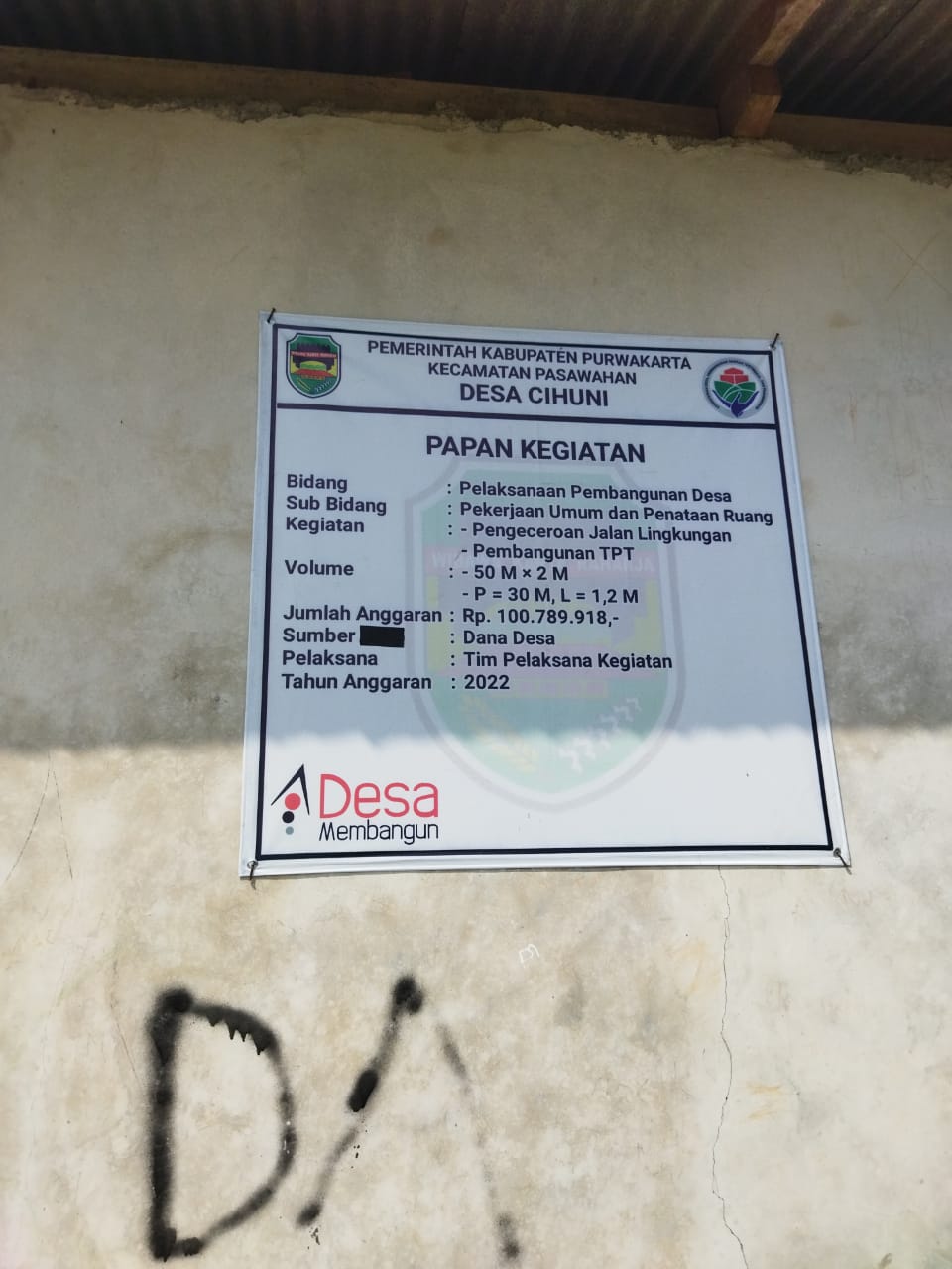 Namun nampaknya hal tersebut tidak dilaksanakan oleh Desa Cihuni, Kec. Pasawahan, pasalnya pada kegiatan Pengecoran Jalan Lingkungan sebesar Rp. 100.789.918 dari Dana Desa, tidak jelas kapan dimulai dan selesainya, sehingga menimbulkan dugaan bahwa kegiatan tersebut sebagai kegiatan siluman.
