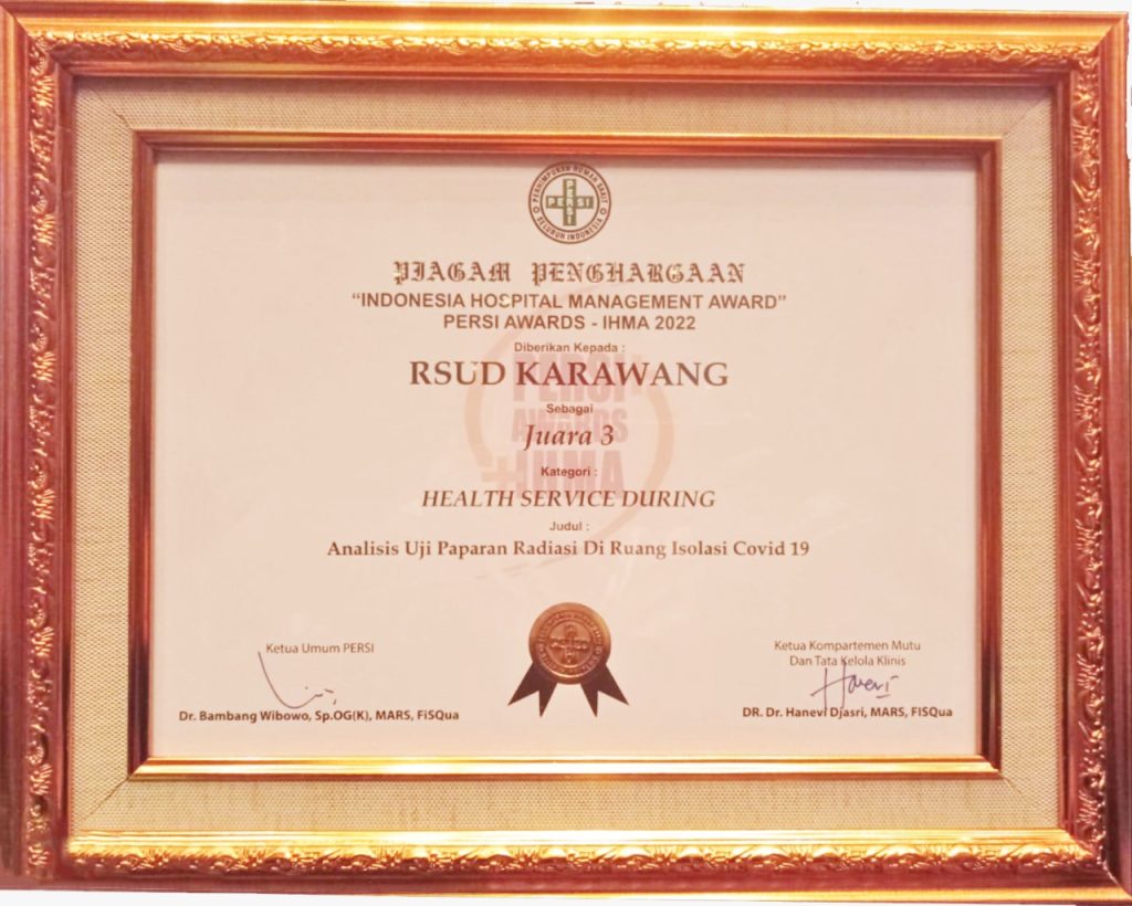 Karawang – Hebat. Rumah Sakit Umum Daerah (RSUD) Kabupaten Karawang berhasil meraih juara 3 juara 3 dalam ajang Perhimpunan Rumah Sakit (Persi) Awards – Indonesia Hospital Management Award (IHMA) 2022 kategori Health Services During Crisis.