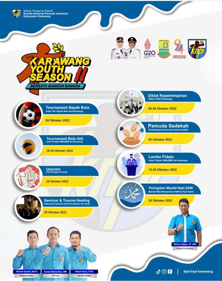 Karawang – 28 Oktober 2022 yang akan datang merupakan Momentum hari sumpah pemuda ke 94 tahun yang tiap tahun diperingati oleh bangsa Indonesia. Termasuk pengurus DPD KNPI Kabupaten Karawang yang menggelar kegiatan Karawang Youth Season jilid II.
