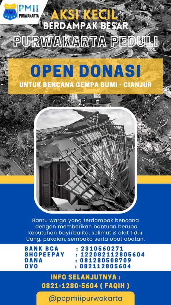 Purwakarta – Pasca tragedi bencana alam gempa bumi yang terjadi di Cianjur padaa Senin (21/11), Pengurus Cabang Pergerakan Mahasiswa Islam Indonesia (PC PMII) Kabupaten Purwakarta melakukan aksi galang dana untuk korban.