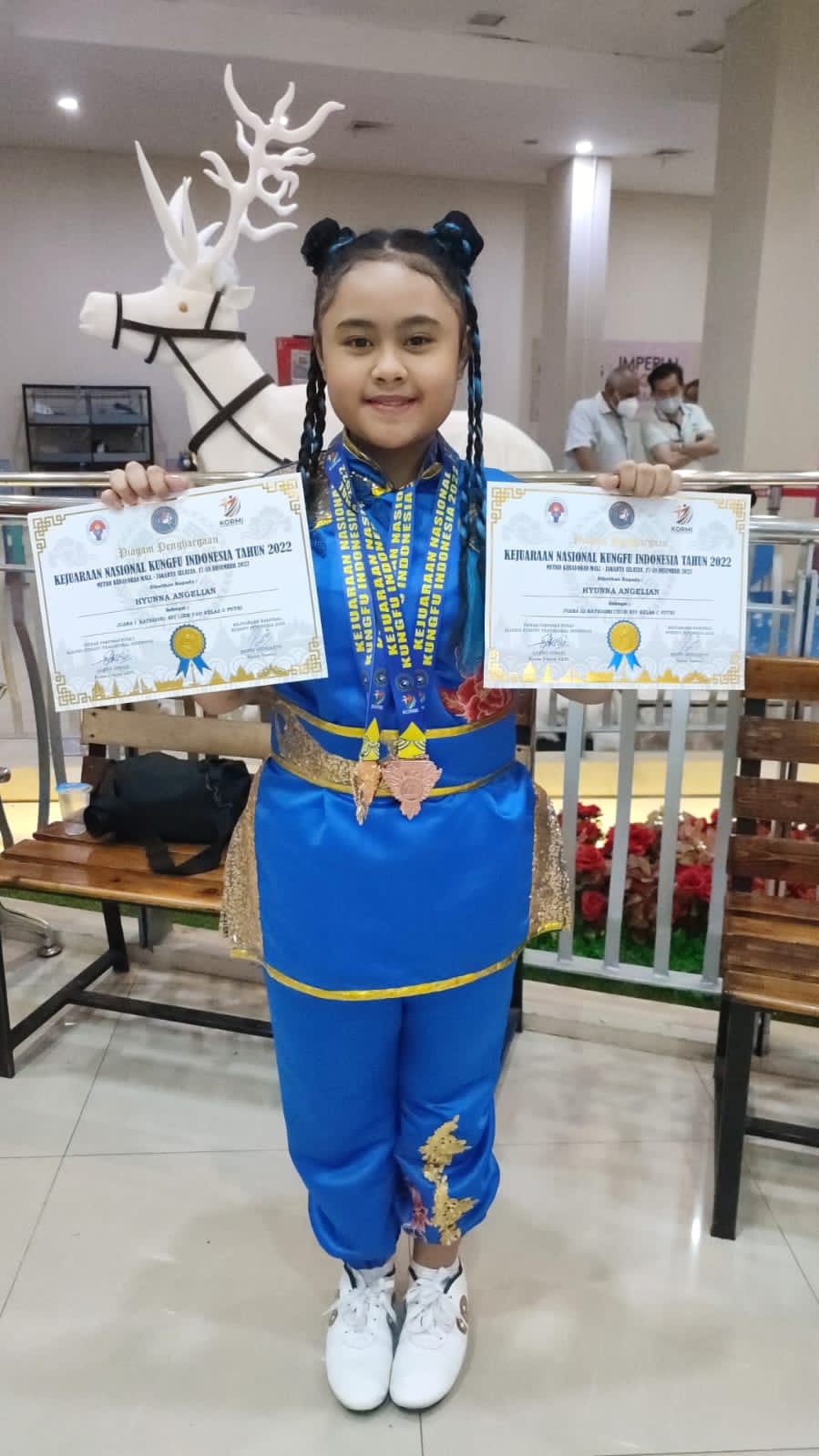 “Alhamdulillah sudah mendapatkan prestasi Juara di Kategori Chum KIU C Putri dan Juara 1 Kategori SIU Liem Tao Kelas C kejuaraan Nasional Kungfu Indonesia 2022. Ini adalah prestasi pertama dia mengikuti pertandingan kungfu setara nasional, tahun 2023 akan mengikuti pertandingan di acara PORPROV ( pekan Olah raga provinsi sama FORNAS ( Festival Olah raga rekreasi masyarakat Indonesia) tingkat nasional. Untuk bulan, tanggal dan tempatnya belum di tentukan,” lanjutnya.