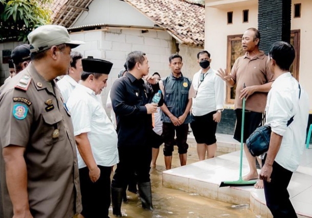 Karawang – Wakil Bupati Karawang, H Aep Syaepuloh, SE meninjau Kampung Rawa Indah, Desa Segaran, Kecamatan Batujaya, Rabu 4 Januari 2022, sekaligus mendistribusikan bantuan untuk warga setempat yang terdampak banjir.