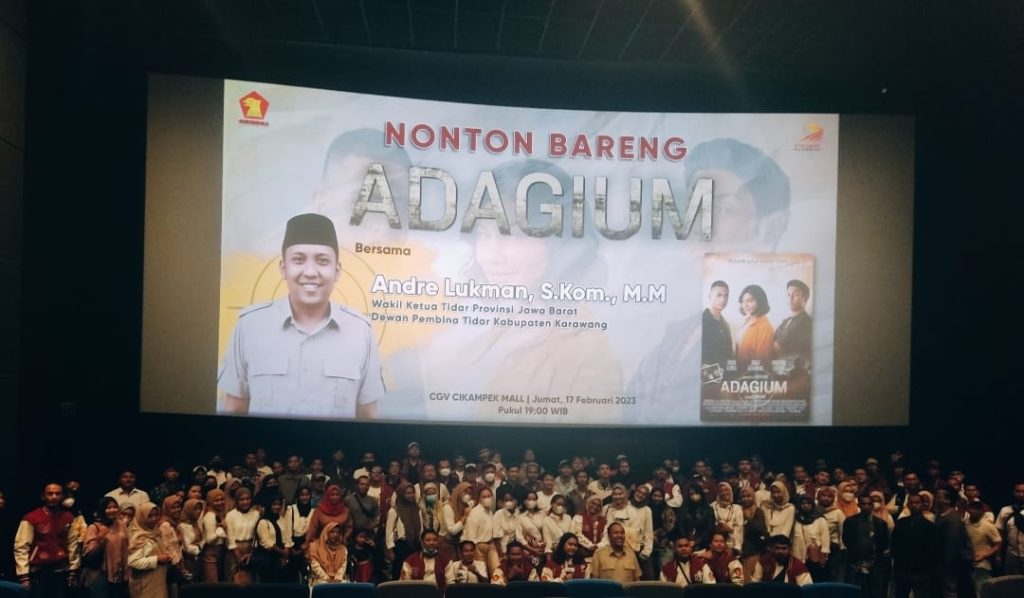Karawang -Dewan Pembina TIDAR Karawang Andre Lukman S.Kom., MM., mengundang ratusan pemuda untuk nonton bareng Film Adagium di Bioskop Mall Cikampek, Jumat (17/2/2023) malam. Kegiatan ini diharapkan menjadi pematik semangat bagi para pemuda dalam membela bangsa dan negara, seperti pesan moral yang disampaikan dalam film tersebut.