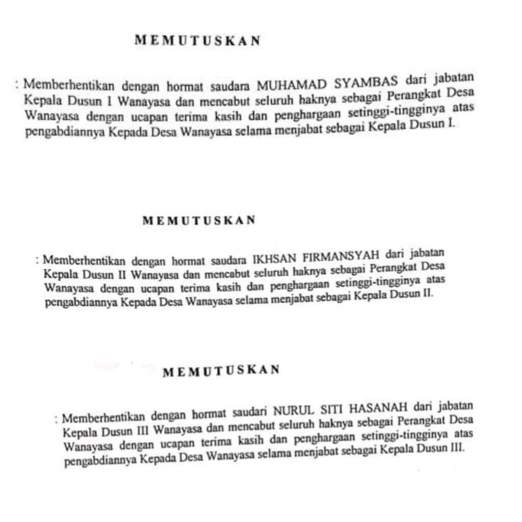Berdasarkan keterangan 3 Kadus Desa Wanayasa kepada awak media, mempertanyakan dasar terbitnya SK Pemberhentian itu dari mana.