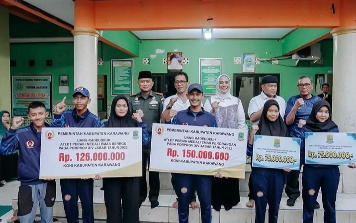 Karawang – Bertempat di Ponpes Al Barokah Nihayatul Amal Kecamatan Purwasari, Bupati Kabupaten Karawang dr. Cellica Nurrachadiana, Sekretaris Daerah Kabupaten Karawang Drs. H. Acep Jamhuri,M.Si dan Ketua Umum KONI Kabupaten Karawang H. Sayuti Haris beserta Muspida Kabupaten Karawang pada Rabu, 5 April 2023 melakukan penyerahan secara simbolis peraih medali Pekan Olahraga Provinsi (Porprov) Jawa Barat.