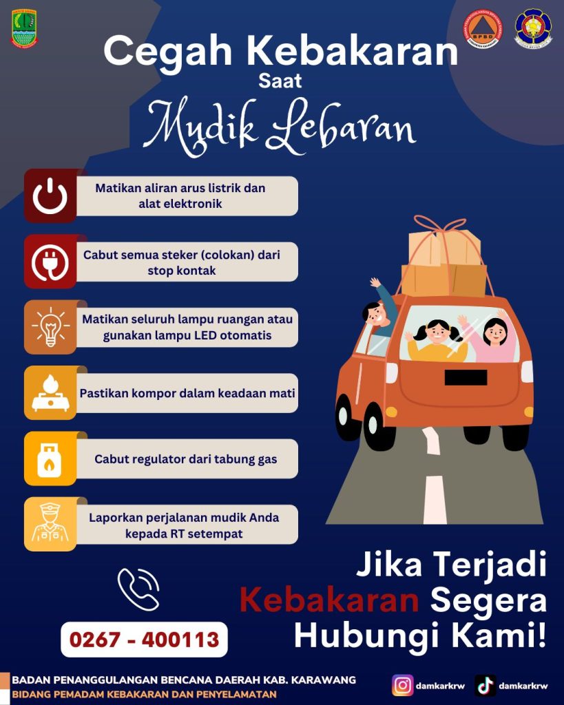 Karawang – Kepala Badan Penanggulangan Bencana Daerah (BPBD) Karawang, Mahpudin memberikan himbauan kepada masyarakat yang akan melakukan mudik agar memeriksa kembali listrik sebelum mudik. Kemudian melepas gas tabung elpiji, melepas aliran listrik pemanas air, kulkas. Selain itu perlu dilakukan koordinasi dan melapor kepada petugas di sekitar tempat tinggal. Hal ini bertujuan untuk mencegah adanya peristiwa kebakaran.