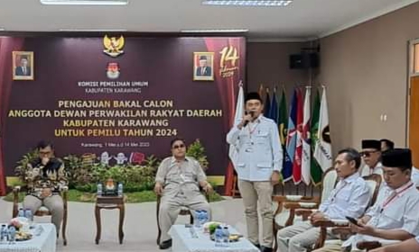 Ketua Badan Pemenangan Pemilu (Bapilu) DPC Partai Gerindra Karawang, H. Danu Hamidi, saat konfrensi pers usai menyerahkan berkas di KPU mengatakan, di Pemilu 2024 Partai Gerindra Karawang sudah mendaftarkan 50 bacaleg yang telah lulus hasil seleksi fit and proper test.