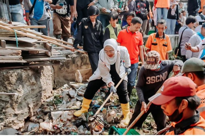 Karawang – Bupati Karawang dr Hj Cellica Nurrachadiana turun tangan ikut membersihkan saluran air yang dipenuhi tumpukan sampah di Desa Cikampek Pusaka Kecamatan Cikampek, Jumat 8 September 2023.