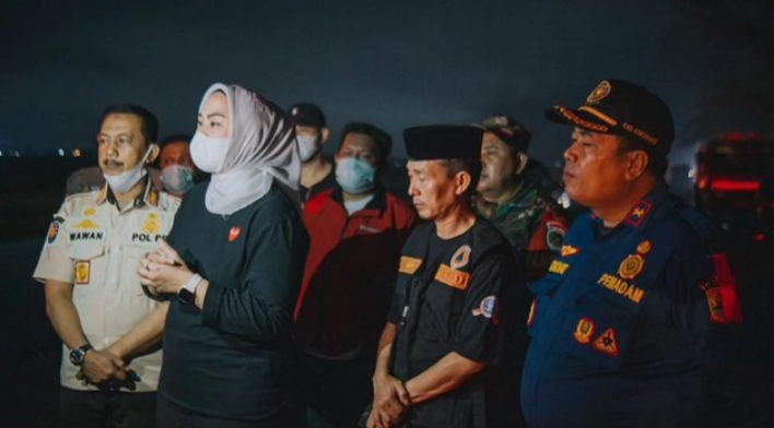 Bupati Karawang dr Hj Cellica Nurrachadiana meninjau langsung lokasi bersama Kepala Dinas Lingkungan Hidup dan Kebersihan (DLHK) serta Kepala BPBD Senin Malam, 30 Oktober 2023.
