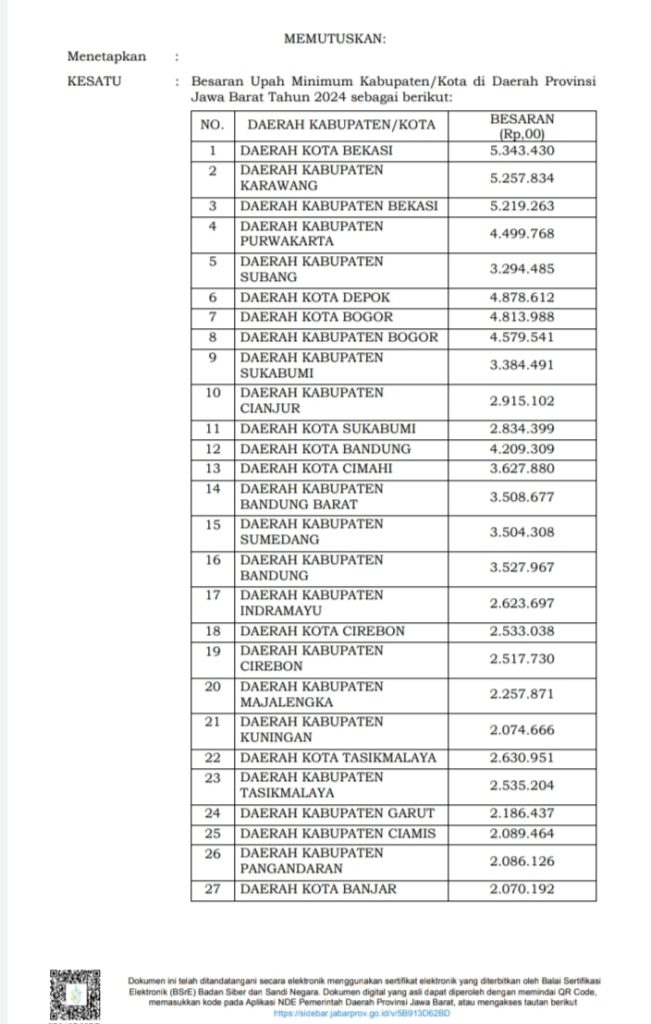 Faktajabar.co.id – Penjabat Gubernur Jawa Barat Bey Machmudin menetapkan Upah Minimum Kabupaten/Kota (UMK) Tahun 2024, Kamis (30/11/2023).