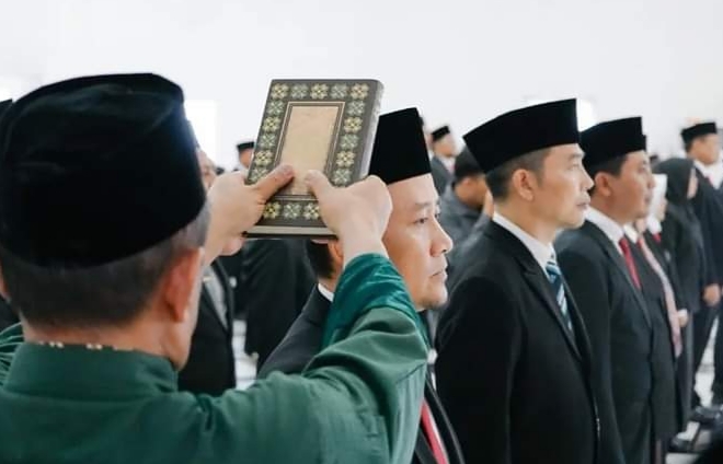 Karawang – Bupati Karawang H. Aep Syaepuloh melantik dan mengambil sumpah jabatan Pejabat Pimpinan Tinggi Pratama, Pejabat Administrator, Pejabat Pengawas dan Kepala UPTD Puskesmas di lingkungan Pemerintah Kabupaten (Pemkab) Karawang, di Aula Husni Hamid pada Sabtu (30/12/2023).