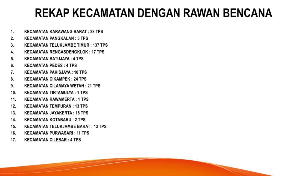 Lanjut Mari, TPS alternatif terbanyak yang disiapkan KPU terdapat di wilayah Kecamatan Telukjambe Timur mencapai 137 TPS. Selanjutnya di Kecamatan Karawang Barat 28 TPS. Kecamatan Cikampek 24 TPS, Kecamatan Cilamaya Wetan 21 TPS, Kecamatan Jayakerta 18 TPS, Kecamatan Rengasdengklok 17 TPS.