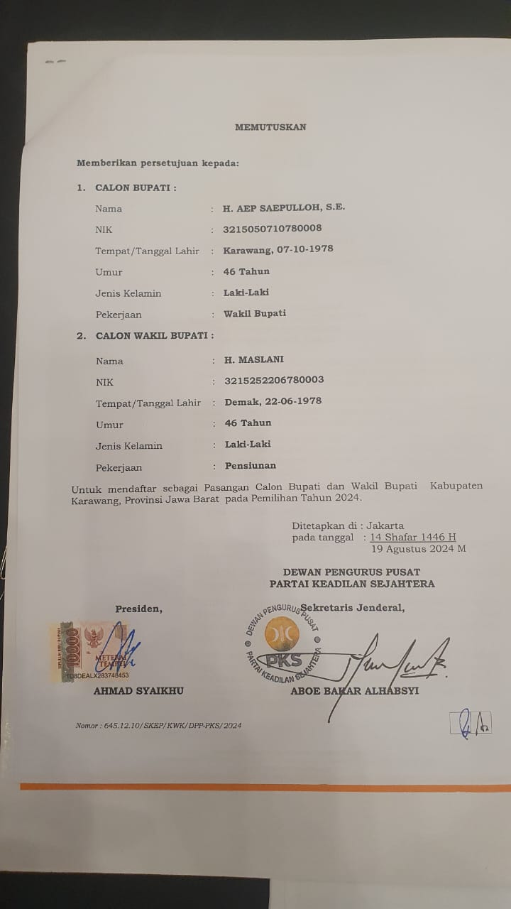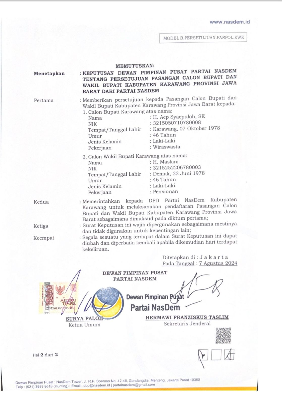 Dari keterangan pers yang disampaikan Ketua DPD PKS Karawang Budiwanto ke TAKtik, keputusan atas pasangan Aep Syaepuloh-Maslani adalah hasil kesepakatan bersama partai pengusung, terutama NasDem dan PKS yang kemudian menyusul PKB.