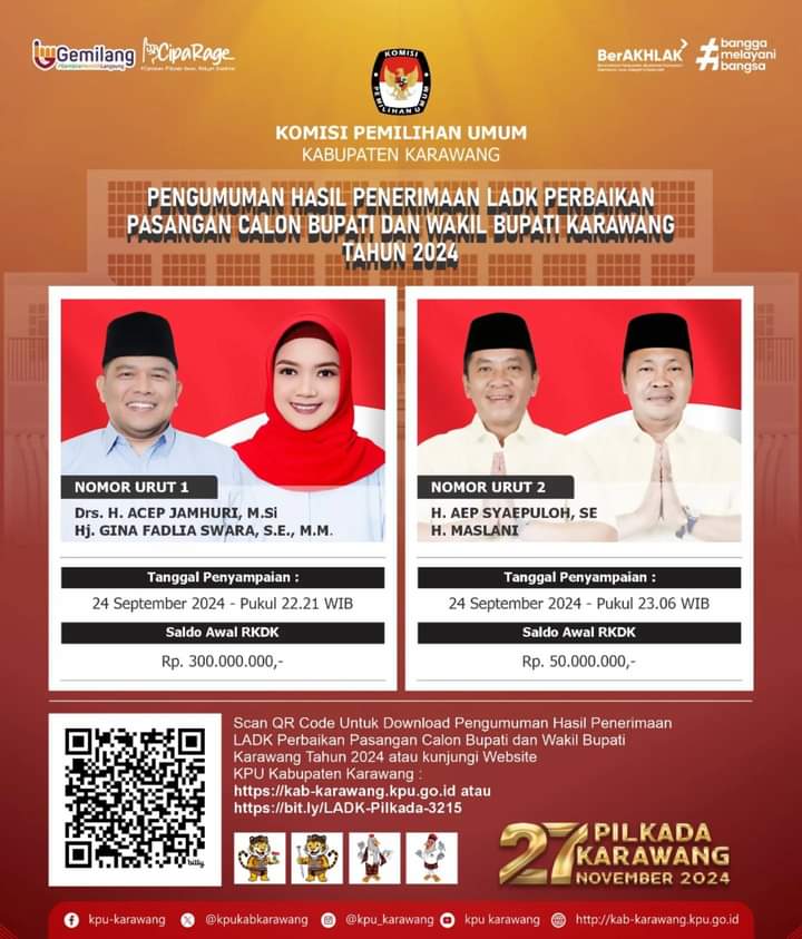 Karawang – Komisi Pemilihan Umum (KPU) Kabupaten Karawang telah mengumumkan Visi-Misi pasangan nomor urut 1 Acep Jamhuri-Gina Fadlia dan Nomor urut 2 H.Aep Saepulloh- H. Maslani calon Bupati-Wakil Bupati Karawang untuk Pilkada 2024.