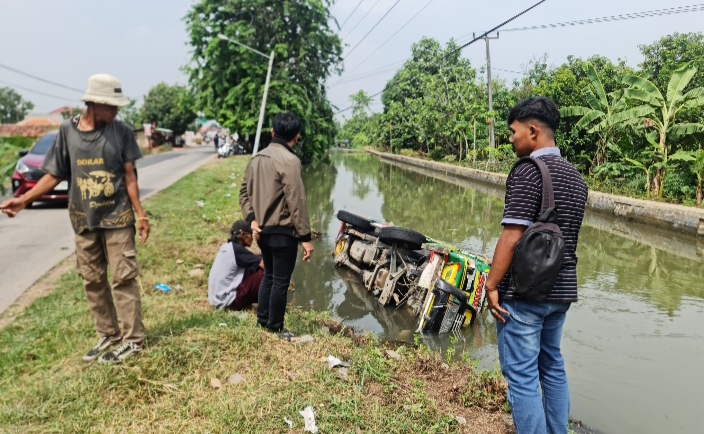 Kendaraan tersebut terperosok ke irigasi saat membawa sekitar 17 penumpang yang hendak menghadiri acara hajatan di Cilamaya.