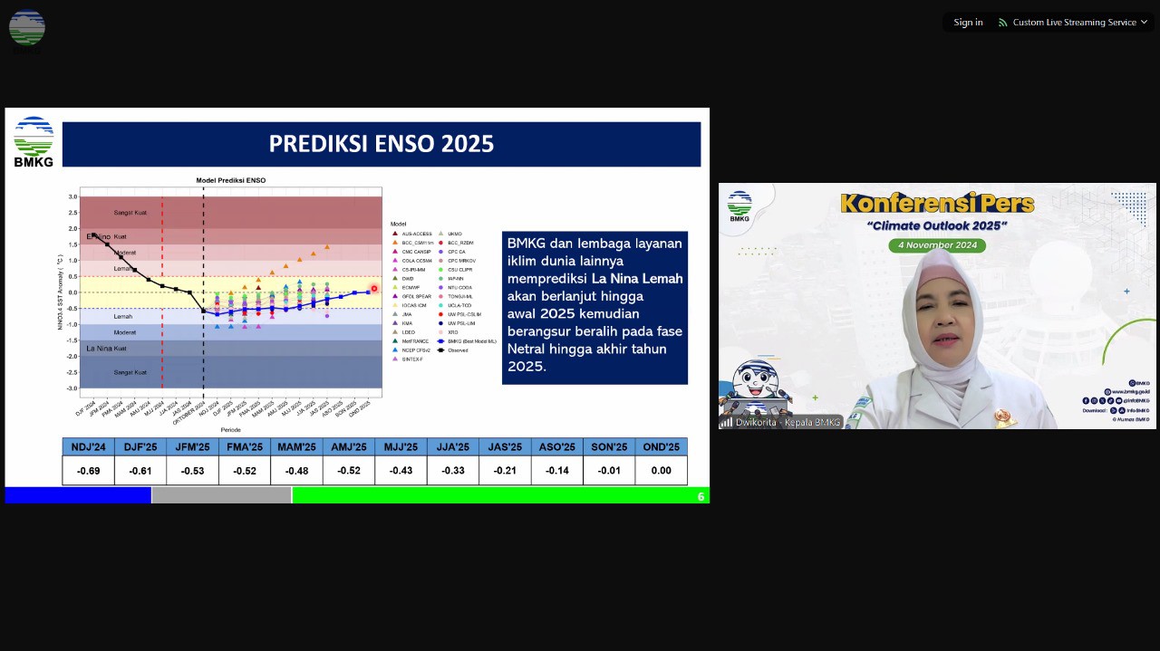 Kepala BMKG, Dwikorita Karnawati menyampaikan, sepanjang tahun 2025 tidak akan terjadi anomali iklim. Hal ini dikarenakan ENSO (El Nino-Southern Oscillation) dan IOD (Indian Ocean Dipole) berada dalam kondisi netral sepanjang tahun 2025. Adapun kondisi La Nina lemah diprediksi akan terus terjadi hingga awal tahun 2025.