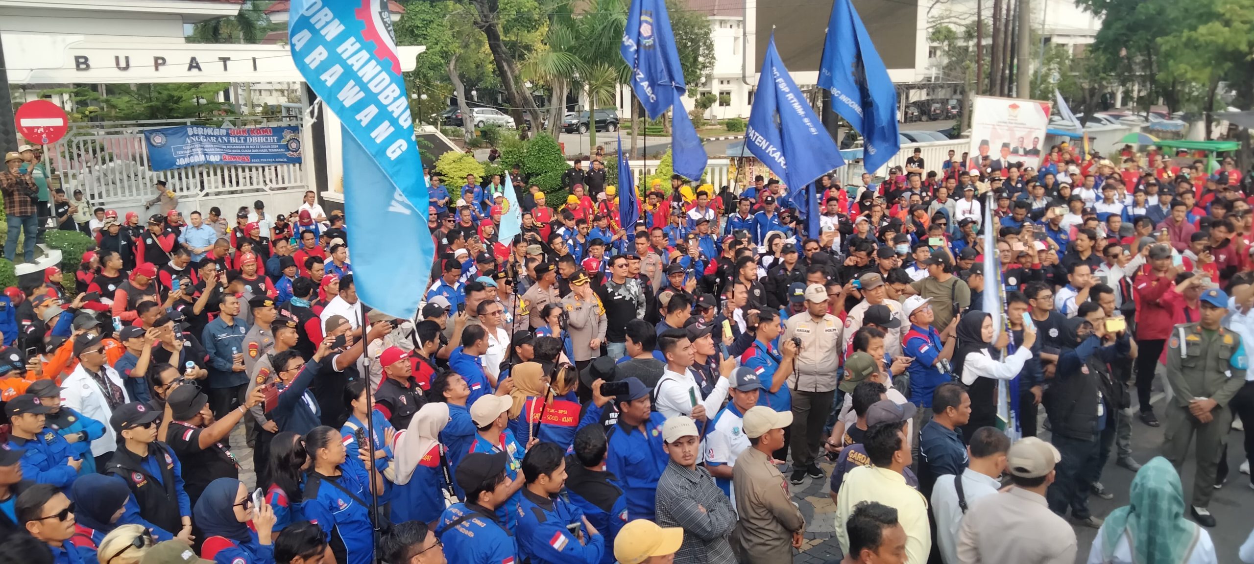 Koalisi Buruh Pangkal Perjuangan (KBPP) Karawang menggelar aksi di depan kantor Pemerintah Daerah (Pemda) Karawang dengan membawa sejumlah tuntutan. Dion Untung Wijaya, Ketua Koalisi Buruh Pangkal Perjuangan mengatakan ingin agar pemerintah pusat menerapkan keputusan yang telah dibuat oleh Mahkamah Konstitusi.