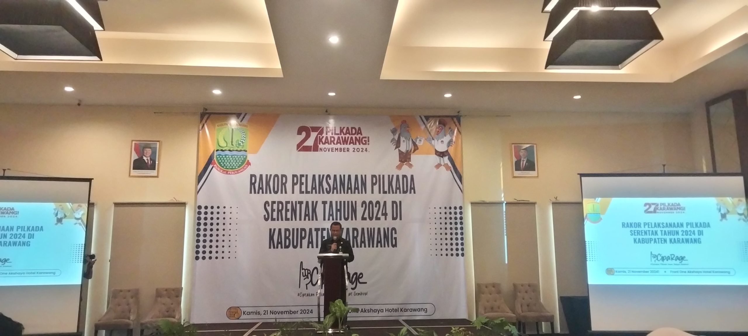 Karawang – Pemerintah Daerah Karawang mengadakan Rapat Koordinasi Penyelenggaraan Pilkada Serentak pada Kamis (21/11) di Hotel Akshaya. Ketua Komisi Pemilihan Umum (KPU) Karawang, Mari Fitriana menyampaikan ada 6 titik penyimpanan logistik tingkat kecamatan yang tidak berada di kantor kecamatan secara langsung. Ia menerangkan untuk di Kecamatan Ciampel saat ini sedang dilakukan renovasi, kemudian untuk 5 titik lainnya disebabkan oleh lokasi di dalam kantor kecamatan yang tidak representatif.