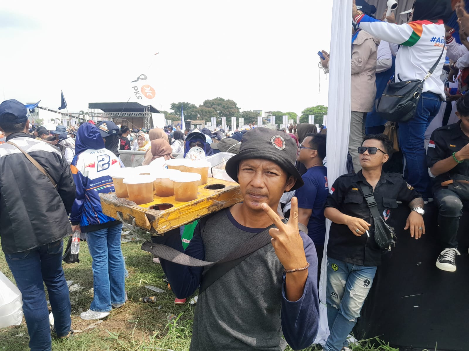 “Hari ini sudah terjual 40 gelas, tadi bawa 100 gelas. Alhamdulillah ramai dari pagi tadi dan sudah dapat sekitar 500 ribu. Waktu kampanye 01 kemarin juga saya berjualan dan dapat untung yang sama besarnya. Dagangan ini milik saya sendiri. Kalau jualan hari biasa tidak sampai 500 ribu,” ujarnya Sabtu (23/11).