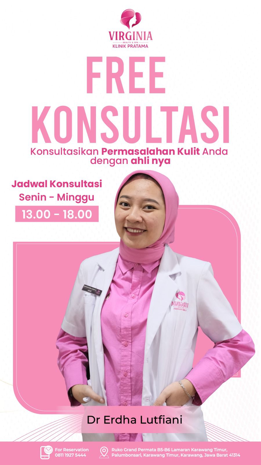 Bagi anda yang ingin memanjakan diri agar kulit cantik dan menawan, tak usah banyak mikir-mikir lagi. Harga terjangkau dikantong dan membuat anda lebih percaya diri. Virginia Beuaty Clinik buka setiap hari dengan jam operasional Pukul 09.00 Wib hingga pukul 21.00 Wib. Yang sibuk bekerja dapat menyesuaikan waktunya untuk datang ke Virginia Beuaty Clinic di Ruko Grand Permata B4-B6 Lamaran, Palumbonsari, Kecamatan Karawang Timur, Jawa Barat.