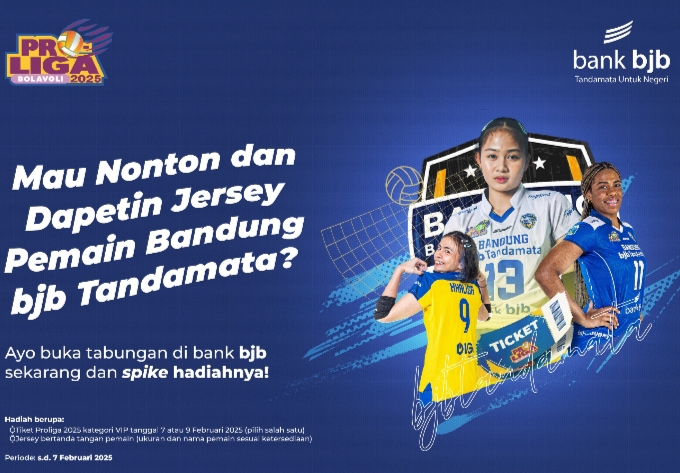 BANDUNG – bank bjb kembali menghadirkan promo menarik bagi para pencinta bola voli di Indonesia. Dalam rangka mendukung gelaran Proliga 2025, khususnya tim kebanggaan Bandung BJB Tandamata, bank bjb meluncurkan program promo spesial yang menawarkan hadiah eksklusif bagi nasabah baru maupun eksisting. Promo ini berlangsung hingga 7 Februari 2025 dan memberikan kesempatan kepada nasabah untuk mendapatkan tiket VIP serta jersey bertanda tangan pemain Bandung BJB Tandamata.