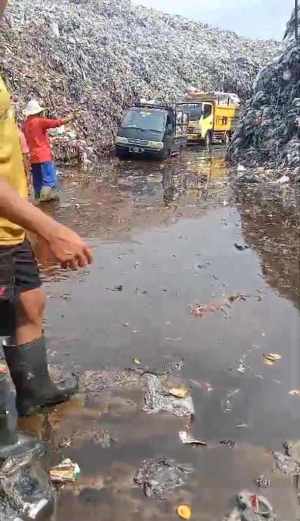 Mirisnya lagi, jalur yang menjadi akses mobil membuang sampah di TPA Jalupang kondisinya tergenang air. Sehingga mobil yang membuang sampah tersebut kesulitan masuk ke TPA Jalupang.