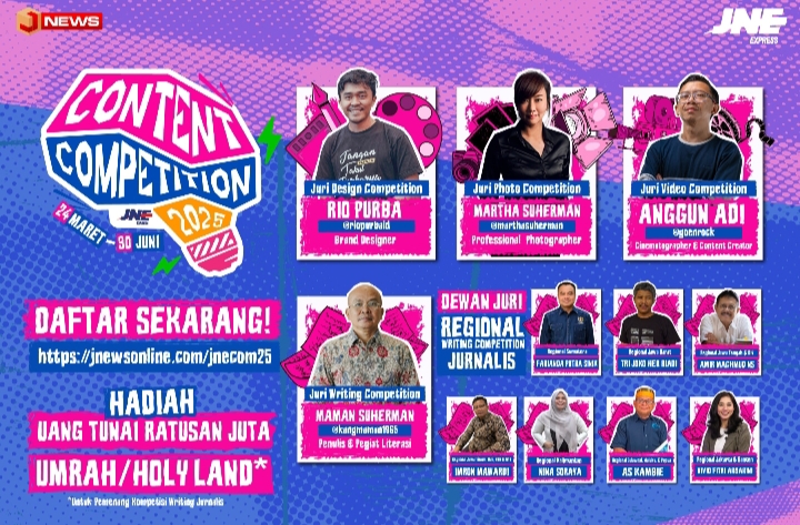 Dengan semangat ‘Inspirasi Tanpa Batas’, JNE mengajak seluruh talenta kreatif di Indonesia untuk berpartisipasi dalam JNE Content Competition 2025. Mari berkarya, tunjukkan ide terbaikmu, dan jadilah bagian dari JNE Content Competition 2025 melalui tautan berikut https://jnewsonline.com/jnecom25/ .(rls/fj)