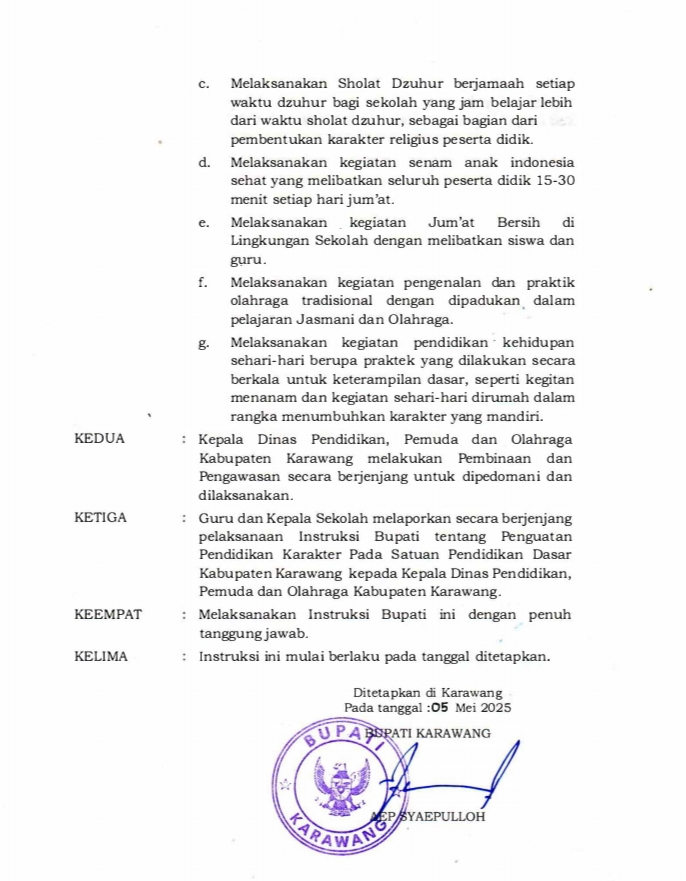 Dengan ini mengintruksikan kepada Kepala Disdikpora, Kabid Lingkungan Dinas Pendidikan,Pemuda dan Olahraga, Korcambidik, Kepala TK, Paud, SD, SMP dan Swasta di lingkungan Dinas Pendidikan Pemuda dan Olahraga Kabupaten Karawang untuk melaksanakan poin-poin surat instruksi Bupati Karawang. Ditetapkan di Karawang, pada tanggal 05 Mei 2025 di cap dan ditandatangani oleh Bupati Karawang Aep Syaepuloh.(red/fj)
