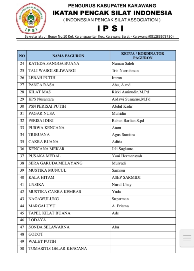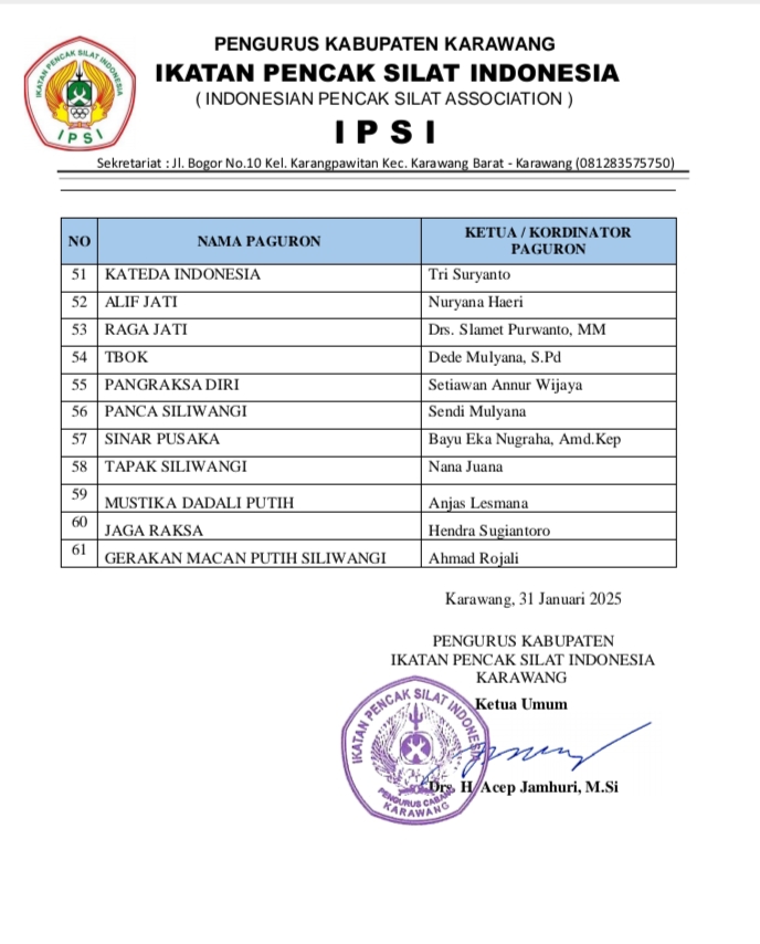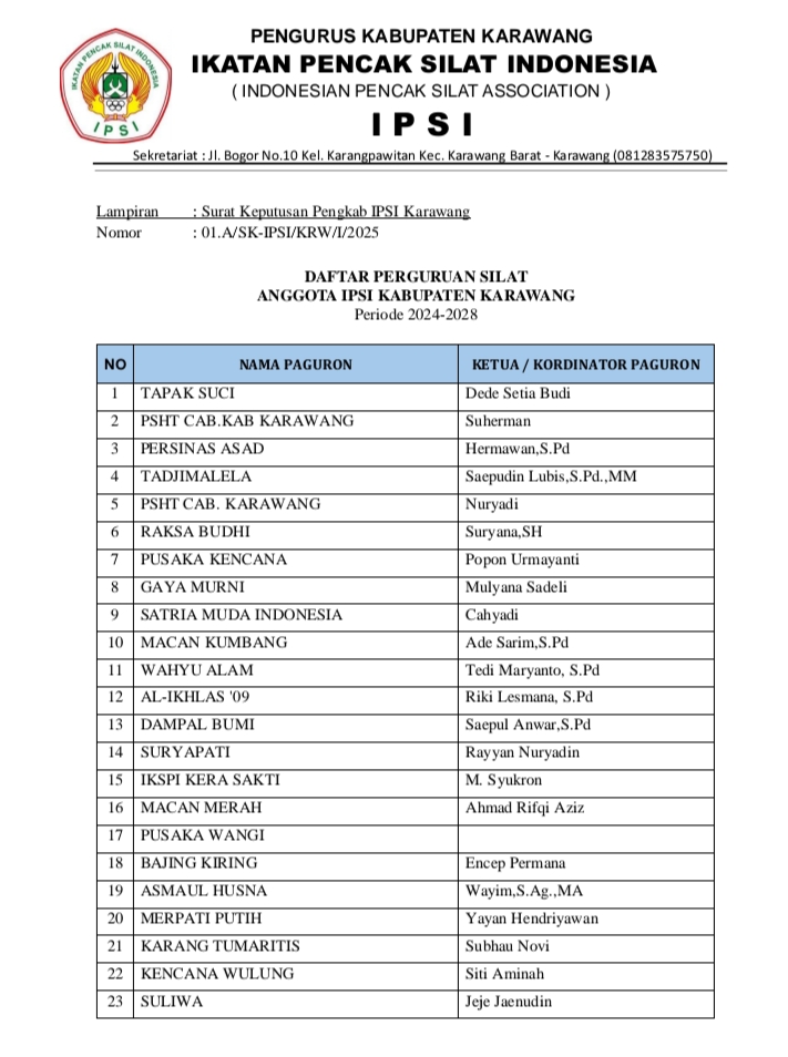 Karawang – Sebanyak 61 Perguruan pencak silat di Kabupaten Karawang yang terdaftar resmi di Ikatan Pencak Silat Indonesia (IPSI) Kabupaten Karawang. Berdasarkan Surat Keputusan (SK) yang dikeluarkan IPSI dengan nomor : 01.A/SK-IPSI/KRW/I/2025 telah ditetapkan pada tanggal 31 Januari 2025.