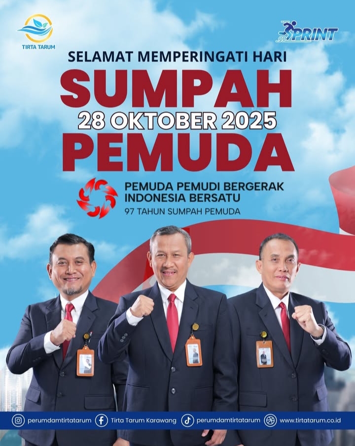 Direksi dan karyawan Perumdam Tirta Tarum Kabupaten Karawang mengucapkan selamat memperinhati Hari Sumpah Pemuda 28 Oktober 2028. Pemuda Bergerak Indonesia Maju.