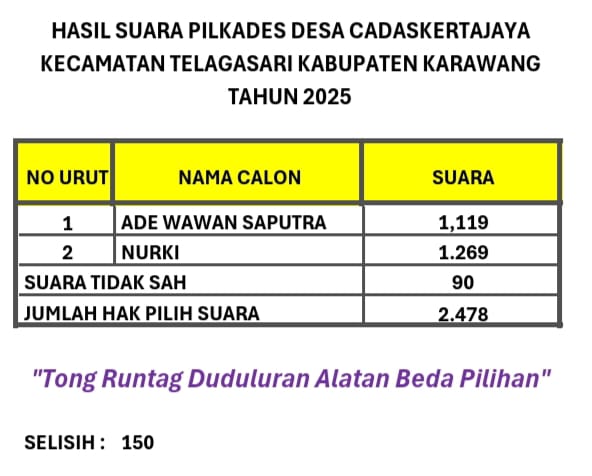 FAKTAKARAWANG – Pemilihan Kepala Desa (Pilkades) Cadaskertaja, Kecamatan Telagasari Kabupaten Karawang, pada Minggu 28 Desember 2025 berakhir aman dan kondusif. Meski sempat tegang dan perang urat saraf antar pendukung, namun bisa terkendali dengan baik. Calon Kades Cadaskertajaya sebanyak 2 calon. Diantaranya nomor urut satu Ade Wawan Saputra dengan meraih 1.119 suara dan Nurki sebanyak 1.269 suara, suara tidak sah sebanyak 90 dengan total jumlah hak pilih 2.478 suara.