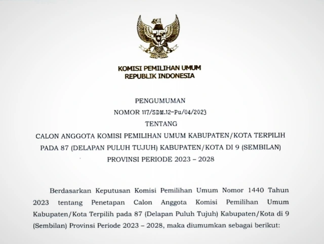 “Berdasarkan Keputusan Komisi Pemilihan Umum Nomor 1440 Tahun 2023 tentang Penetapan Calon Anggota Komisi Pemilihan Umum Kabupaten/Kota Terpilih pada 87 Kabupaten/Kota di 9 Provinsi Periode 2023-2028, maka diumumkan sebagai berikut,” bunyi salinan surat tentang pengumuman tersebut seperti dikutip tvberita.co.id, Minggu, 29 Oktober 2023.