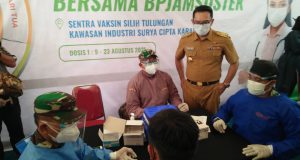 Karawang – Gubernur Jawa Barat Ridwan Kamil di dampingi Bupati Karawang dr. Hj. Cellica Nurrachadiana, Direktur Utama BPJS Ketenagakerjaan Anggoro Eko Cahyo, Forkopimda Jawa Barat, Kapolda & Pangdam III Siliwangi menghadiri Peluncuran Program Vaksinasi Silih Tulungan di Kawasan Industri Suryacipta, Karawang, Senin (9/8). Pada kesempatan itu Gubernur menjelaskan peluncuran program vaksinasi silih tulungan ini mengingat Kabupaten Karawang salah satu kabupaten ...