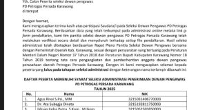 KARAWANG – Tiga nama ini lulus tahapan Adminisrasi calon Dewan Pengawas Petrogas. Dari 17 pendaftar hanya 3 saja yang dinyatakan lulus administrasi. Data yang dihimpun Fakta Jabar nama tersebut adalah 1. Agus Rivai 2. dr. Atta Subagjadinata 3.Ikhsan Indra Putra. Nama tersebut dinyatakan lulus administrasi. Sebelumnya, Pendaftaran seleksi calon Dewan Pengawas PD Petrogas Persada Karawang resmi ditutup pada Selasa, 17 ...