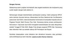 Surat RSKP yang tersebar Karawang – Manajemen dan direksi Rumah Sakit Khusus Paru (RSKP) milik Pemkab Karawang diduga telah abai atas sejumlah hak para pegawainya. Dari mulai hak remunerasi yang dalam beberapa bulan belum dibayar, pemberian THR Idul Fitri 2023 tak sesuai dengan aturan, hingga masalah ATK sebagai penunjang kerja. Kepada wartawan, sejumlah pegawai mengaku sakit hati karena menerima uang ...