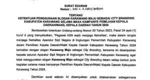 KARAWANG – Bupati Karawang mengeluarkan Surat Edaran yang ditujukan kepada Kepala Perangkat Daerah di lingkungan Pemkab Karawang tidak lagi penggunaan slogan Karawang maju. Diketahui Surat Edaran dengan Nomor: 200.2.6/4817/BKPSDM yang ditandatangani oleh Sekretaris Daerah (Sekda) Kabupaten Karawang atas nama Bupati Karawang tentang ketentuan penggunaan slogan Karawang sebagai City Branding Kabupaten Karawang selama masa kampanye Pemilihan Kepala Daerah/ Wakil Kepala Daerah tahun ...