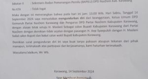 Karawang – Romadhoni, S.Sy. ketua sayap Gemuruh Nasdem kabupaten Karawang sekaligus Sekretaris Badan Pemenangan Pemilu (BAPILU) DPD partai NasDem Kabupaten Karawang hari ini, Sabtu (14/9/2024), resmi menyerahkan surat pengunduran diri dari kepengurusan Partai NasDem Kabupaten Karawang. Surat itu disampaikan tepat hari ini di kantor DPD partai NasDem Kabupaten Karawang dan diterima oleh H. Mulyadi ketua Bidang OKK sekaligus ketua Fraksi ...