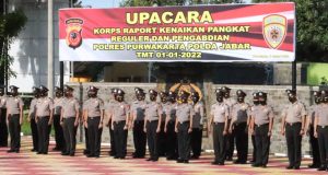 Purwakarta – Puluhan anggota Polres Purwakarta mendapat kado istimewa dari institusinya, di awal tahun 2022 ini. Kebahagian dirasakan puluhan anggota Polres Purwakarta mulai dari bintara hingga perwiranya. Sebanyak 67 personel Polres Purwakarta dinaikkan pangkatnya setingkat lebih tinggi mulai dari Brigadir Polisi (Bripol) hingga Komisaris Polisi (Kompol). Upacara kenaikan pangkat tersebut digelar di halaman Mapolres Purwakarta, Jalan Veteran, Kelurahan Ciseureuh, Kabupaten ...