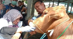 Dokter Hewan Dinas Pertanian dan Ketahanan Pangan sedang melalukan pemeriksaan hewan Karawang – Dinas Pertanian dan Ketahanan Pangan terus mendata wilayah yang terjangkit kasus penyakit mulut dan kuku (PMK) pada hewan ternak di Kabupaten Karawang. Data hari Rabu, (8/6/2022) sudah sebanyak 18 kecamatan yang mengalami kasus PMK. Bahkan, petugas kesehatan hewan melakukan sidak ke penjual hewan di Kampung Kalen Oncom, ...