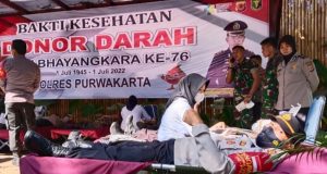 PURWAKARTA – Dalam rangka menyambut hari ulang tahun (HUT) ke-76 Bhayangkara, Kepolisian Resor (Polres) Purwakarta menggelar donor darah yang bekerjasama dengan PMI Kabupaten Purwakarta di Taman Presisi Mapolres Purwakarta, Pada Selasa, 7 Juni 2022. Kegiatan ini diikuti langsung Kapolres Purwakarta, AKBP Suhardi Hery Haryanto beserta Pejabat Utama dan Kapolsek jajaran serta anggota Polres Purwakarta, Kodim 0619/Purwakarta, Resimen Armed 1/1 Kostrad ...