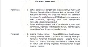 Karawang – Sebanyak 65 pengurus KONI Kabupaten Karawang telah ditetapkan. Berdasarkan Surat Keputusan (SK) KONI Jawa Barat dengan Nomor :79 Tahun 2025 tentang Pengukuhan Personalia Kepengurusan KONI Kabupaten Karawang masa banti 2025-2029. Dalam SK tersebut Ketua KONI Provinsi Jawa Barat mencatatkan hal menimbang,mengingat,memperhatikan susunan personalia kepengurusan KONI Kabupaten Karawang masa bakti 2025-2030. Ditetapkan di Bandung, 15 April 2025 ditandatangani Ketua ...