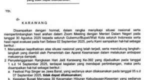 KARAWANG – Bupati Karawang Aep Syaepuloh membatalkan sejumlah agenda peringatan Hari Jadi Kabupaten Karawang ke-392. Pembatalan itu mengacu pada situasi keamanan nasional saat ini dan arahan dari Menteri Dalam Negeri kepada Gubernur/Bupati/Walikota di seluruh Indonesia. Bupati menyampaikan pembatalan beberapa rangkaian peringat HUT Karawang melalui surat resmi bernomor 400.14.1.1/ 2601/Kesra yang ditandatangani 3 Agustus 2025. Pada surat itu disebut ada tiga ...