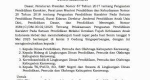 Karawang – Bupati Karawang mengeluarkan surat instruksi Nomor :188.342/1077/Kesra/2025 tentang Penguatan Pendidikan Karakter pada Satuan Pendidikan Dasar Kabupaten Karawang. Dasar peraturan Presiden Nomor 87 Tahun 2017 tentang Penguatan Pendidikan Karakter, Peraturan Menteri Pendidikan dan Kebudayaan Nomor 20 Tahun 2018 tentang Penguatan Pendidikan Karakter pada Satuan Pendidikan Formal, Surat Edaran Direktur Jendral Pendidikan Anak Usia Dini, Pendidikan Dasar dan Pendidikan Menengah ...