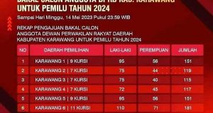 Data KPU Karawang Karawang – Sebanyak 834 daftar nama bakal calon legislatif (Bacaleg) yang berasal dari ke-18 peserta partai politik pada Pemilihan Umum (Pemilu) 2024, resmi diajukan sebagai Bacaleg di Kantor Sekretariat KPU Kabupaten Karawang. “Dalam kurun waktu dua pekan terakhir kemarin, pendaftaran nama mereka secara resmi tlah diajukan oleh masing-masing partai politik yang diajukan berdasarkan daerah pemilihan (dapil) dan ...