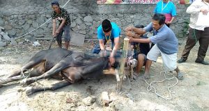 KARAWANG – Tidak ada keraguan yang nampak saat Kapolsek Klari menjadi tukang jagal saat penyembelihan hewan kurban di Mapolsek Klari, Minggu (11/8). Diketahui Kepolisian Sektor (Polsek) Klari Polres Karawang menyembelih enam ekor sapi pada Hari Raya Idul Adha 1440 Hijriyah. Dari enam ekor sapi itu, dua ekor di antaranya disembelih di Polres Karawang dan empat ekor lainnya dipotong di Mapolsek ...
