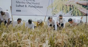 Karawang – Menteri Koordinator Bidang Kemaritiman dan Investasi Indonesia, Luhut Binsar Panjaitan menyaksikan panen padi Ratun R5 di Jalan Lingkar Tanjungpura, Kabupaten Karawang, Jumat (7/4/2022) pagi. Panen Padi Ratun R5 di Karawang merupakan panen ketiga kalinya. Kegiatan tersebut diinisiasi Ikatan Alumni Institut Teknologi Sepuluh November (IKA ITS). Hadir Rektor ITS Surabaya, Ketua Ika ITS, Bupati Karawang, Dandim 0604 dan Wakapolres ...