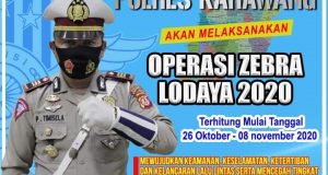 Karawang – Senin 26 Oktober 2020, Polres Karawang akan menggelar Operasi Zebra Lodaya 2020 selama dua minggu sampai 8 November 2020, dengan menitik beratkan penekanan keselamatan lalu lintas, urai kemacetan, dan adaptasi kebiasaan baru pencegahan covid19. “Operasi tetap mengedepankan protokol kesehatan, dalam memutus mata rantai penyebaran covid 19,” kata Kasat Lantas Polres Karawang, AKP Peterson Timisela, di Mapolres Karawang, Jumat ...