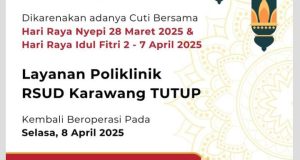 Besok, Selasa 8 April 2025 layanan Rumah Sakit Umum Daerah (RSUD) Karawang telah dibuka kembali. Berdasarkan informasi dari akun sosiam media RSUD Karawang menyampaikan infomasi demikian. Namun sebelumnya, layanan poliklinik RSUD Karawang ditutup karena adanya cuti bersama dan hari raya nyepi tanggal 28 Maret 2025 dan hari raya idul fitri tanggal 2 hingga 7 April 2025. Untuk kondisi gawat darurat ...